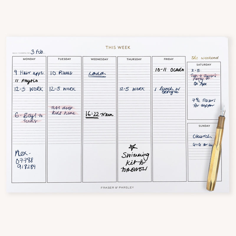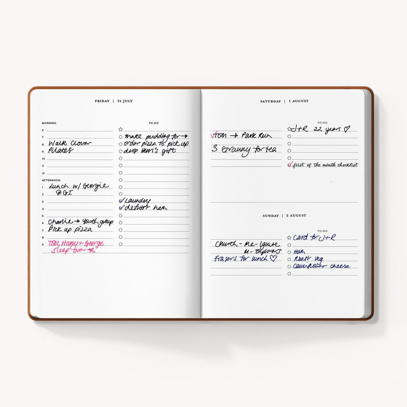 Featuring hourly time slots from 6am - 9pm, a day per page (weekends share a page), a long to-do list on each day and a scribble space at the bottom. With soft gold foiling details, luxury paper, 2 grosgrain page markers and made in England.